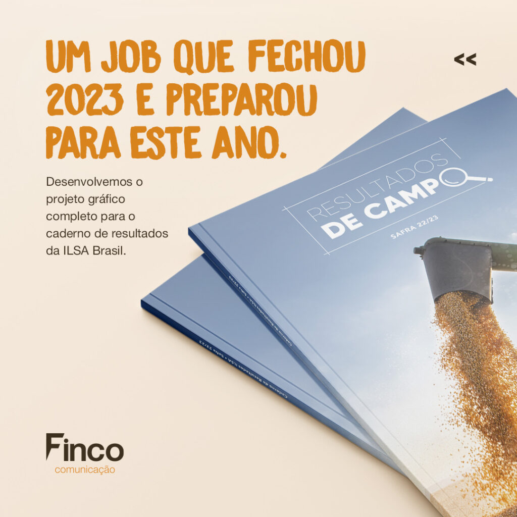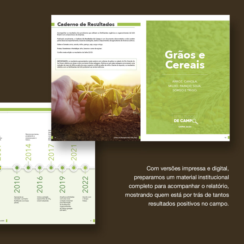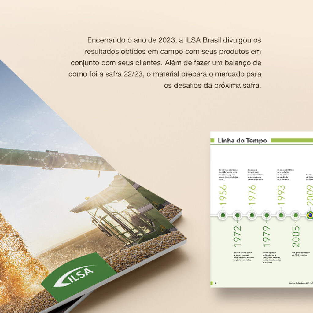 Desenvolvemos todo o projeto gráfico do caderno de resultados da ILSA Brasil para a safra 22/23. Um excelente material para fechar o ano com um balanço completo dos resultados e iniciar 2024 com uma boa visão do que está por vir nas próximas safras.